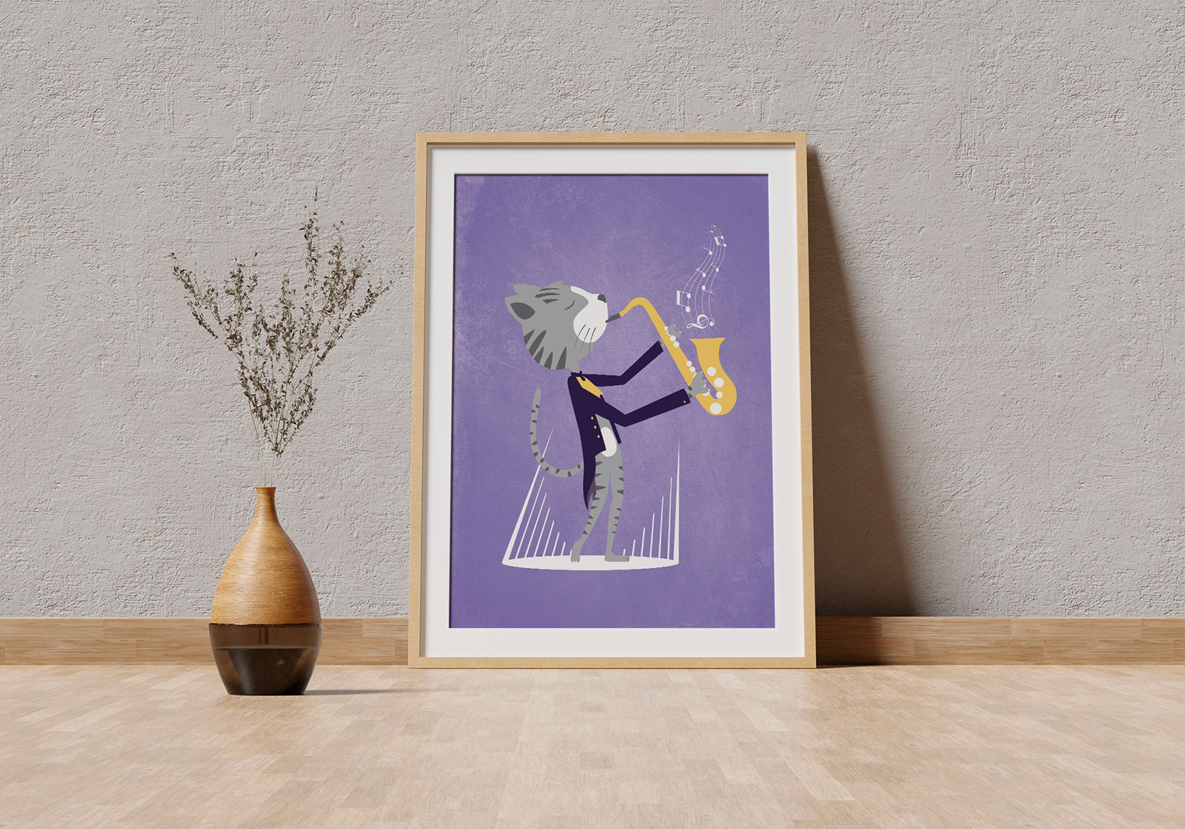 Dans le cadre de l’expo ‘Spotlight’ portant sur le thème de la musique, Curlie a dessiné et imprimé à la main en sérigraphie, l’affiche intitulée ‘Catsophoniste’. Un chat tout en élégance, qui joue du saxophone.